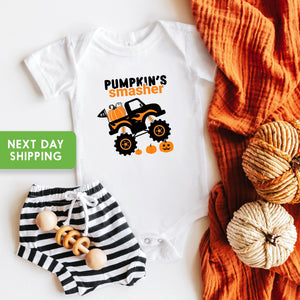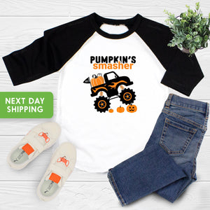Pumpkin Smasher Baby OnesieĀ®, Monster Truck Raglan, Halloween Monster Truck Toddler Shirt, Funny Boys Fall Graphic Baseball Tee