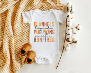 Pumpkins, Hayrides, Flannels Sweaters, Bonfires, Favorite Things OnesieĀ®, Fall Baby OnesieĀ®, Cute Pumpkin Gift, Fall Outfit For Girl
