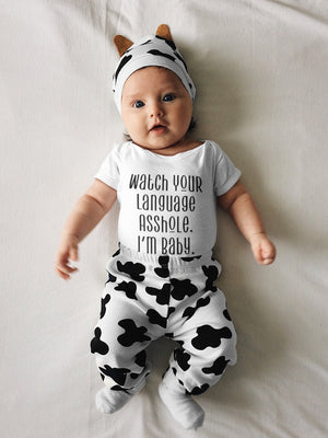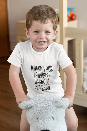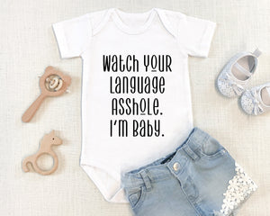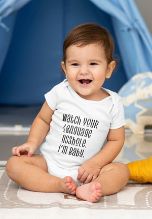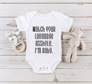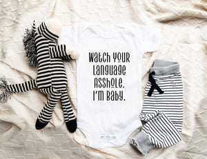 Watch Your Language A Hole OnesieĀ® Funny Baby Bodysuit, Baby Shower Gift, Funny Baby Bodysuit, Cute Baby Shirt